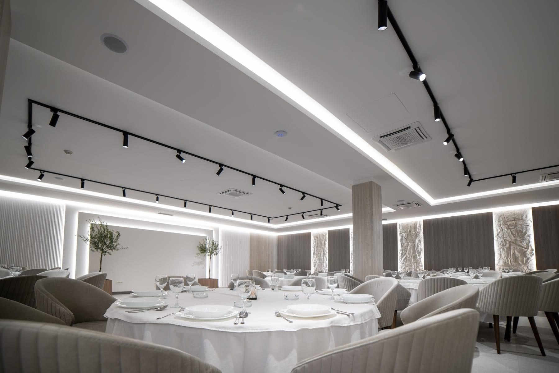 Jedan od ključnih elemenata dizajna interijera je rasvjeta. Kombinacija indirektnog LED osvjetljenja uvučenog u niše plafona i direktne rasvjete postavljene na crne šinske nosače stvara atmosferu luksuza, ali i funkcionalne osvijetljenosti. Svjetlosni elementi dodatno ističu teksture na zidovima i arhitektonske linije prostora.
