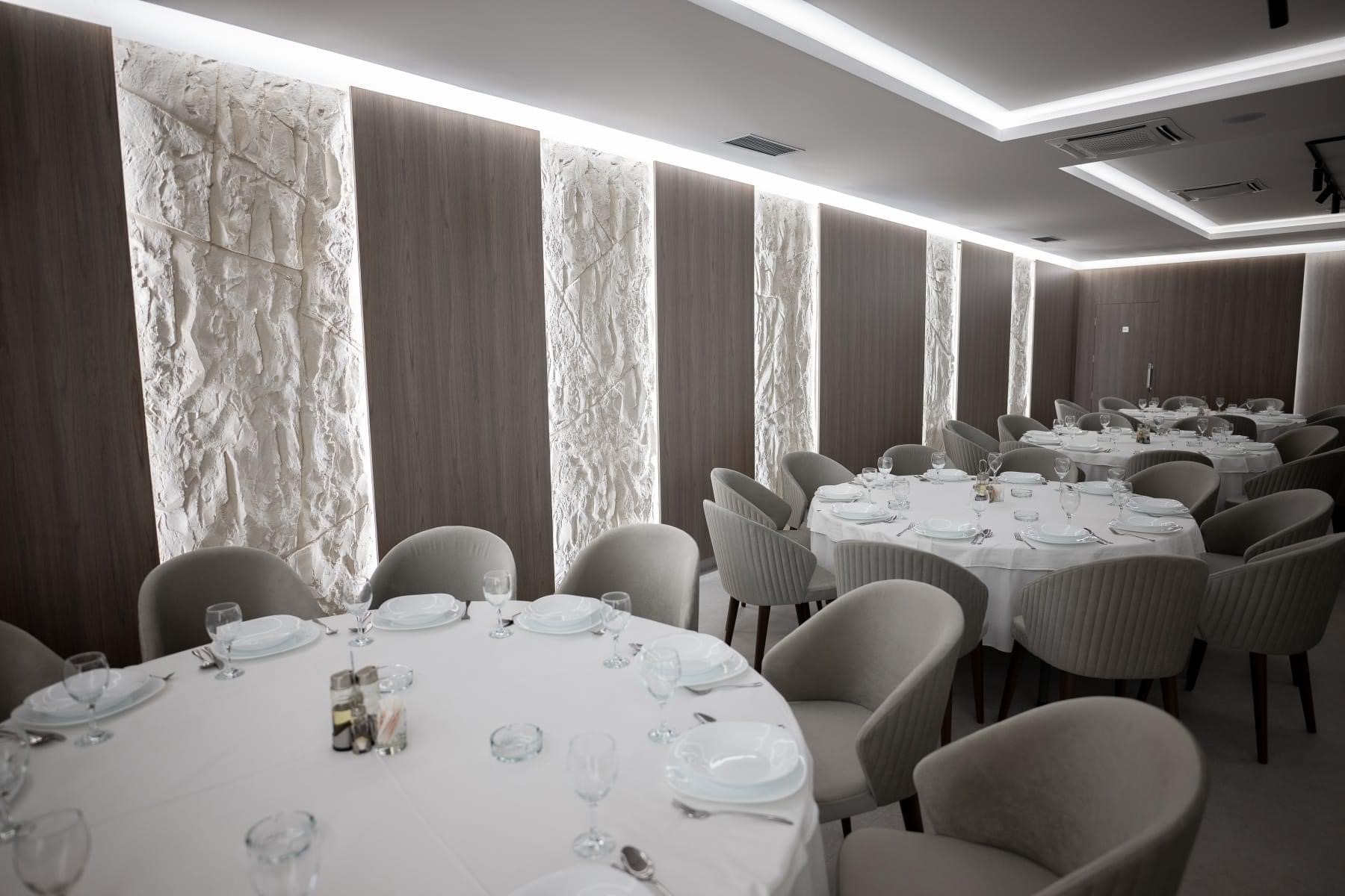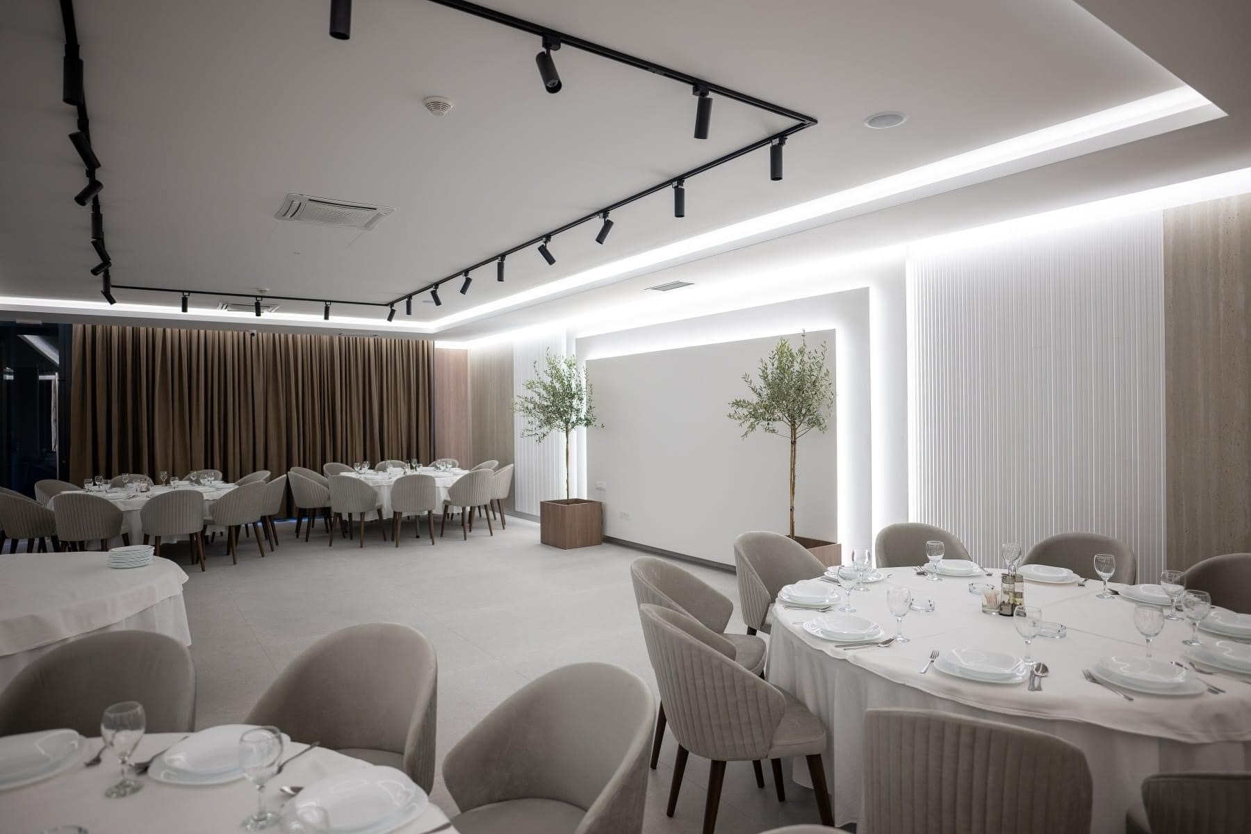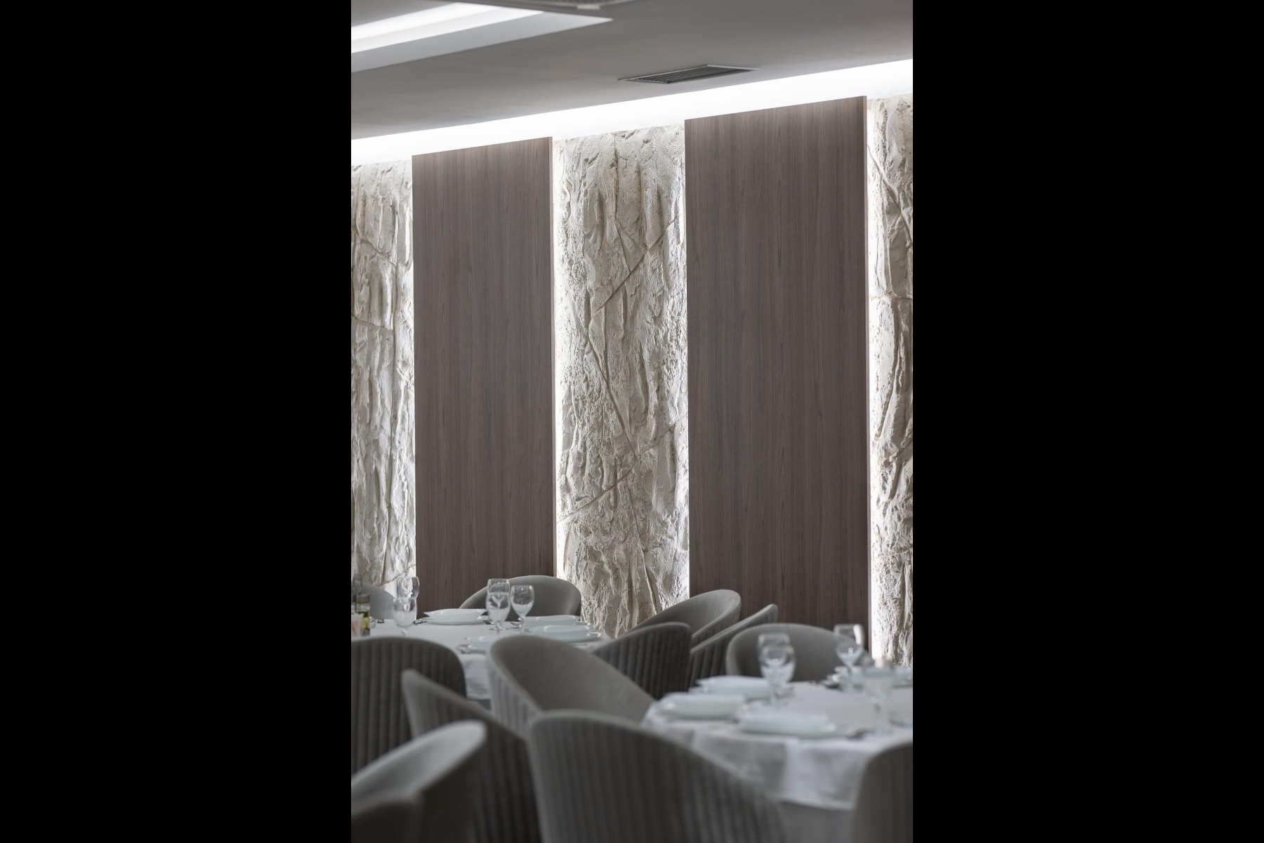 Pod je obložen velikim keramičkim pločicama svijetlosive boje, koje doprinose sofisticiranom izgledu, a istovremeno omogućavaju lako održavanje. Zidovi su obrađeni kombinacijom drvenih obloga i dekorativnih panela sa teksturom prirodnog kamena, čime se postiže dinamika i topla atmosfera. Strop je izveden kao spuštena konstrukcija sa višeslojnim osvjetljenjem.