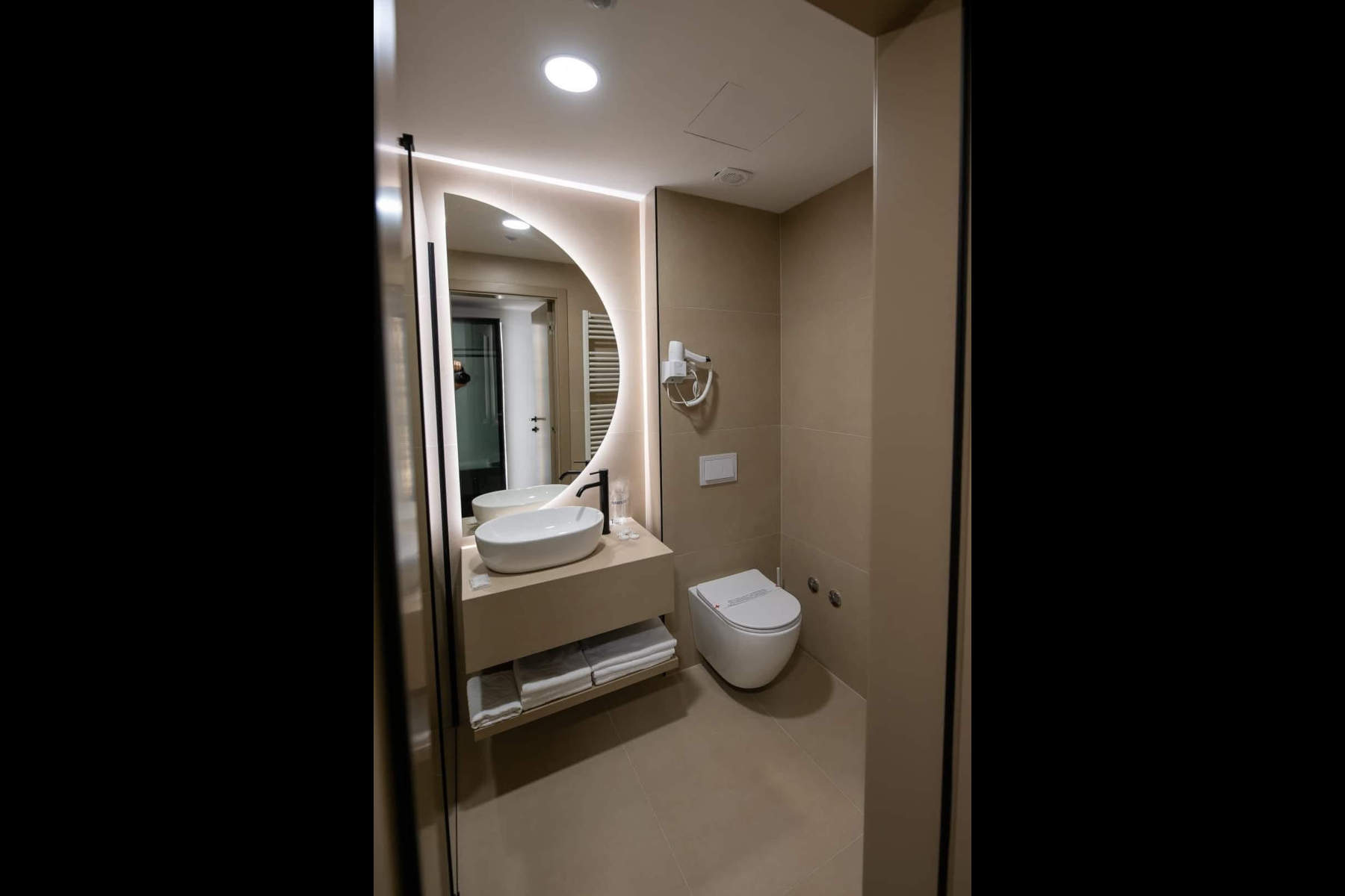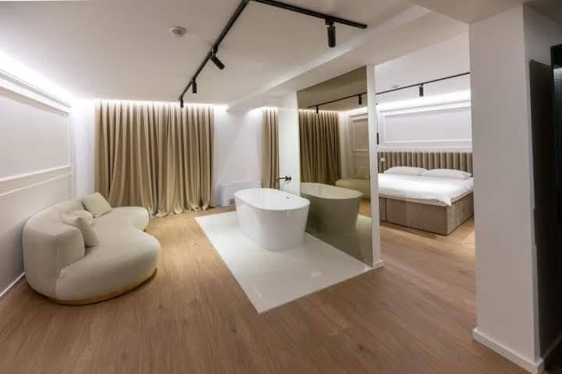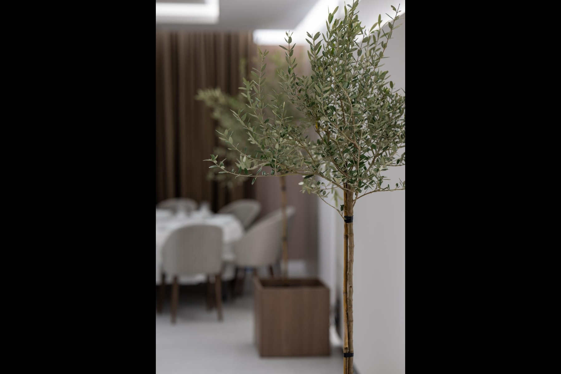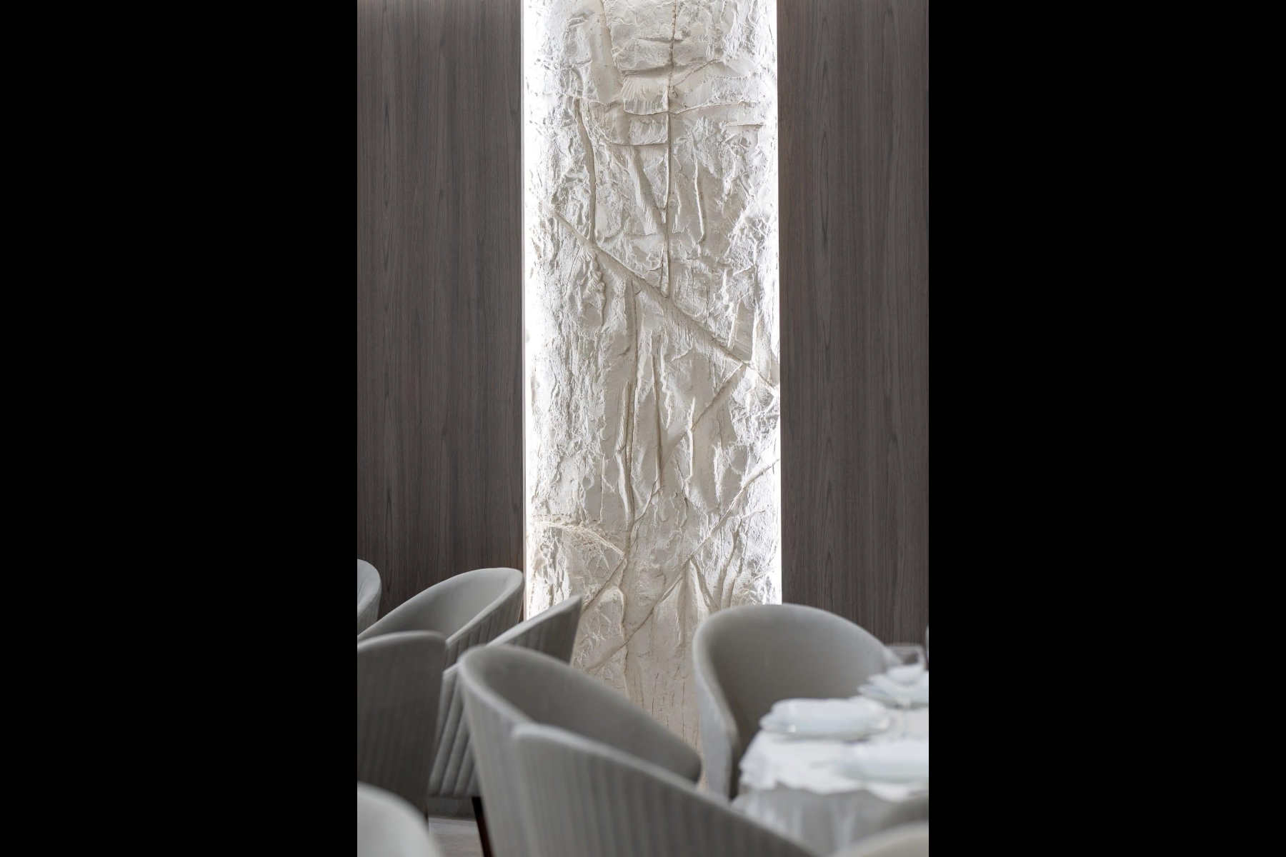 Pod je obložen velikim keramičkim pločicama svijetlosive boje, koje doprinose sofisticiranom izgledu, a istovremeno omogućavaju lako održavanje. Zidovi su obrađeni kombinacijom drvenih obloga i dekorativnih panela sa teksturom prirodnog kamena, čime se postiže dinamika i topla atmosfera. Strop je izveden kao spuštena konstrukcija sa višeslojnim osvjetljenjem.