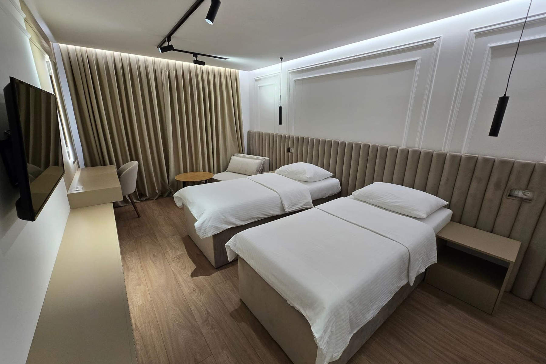 Pod je obložen velikim keramičkim pločicama svijetlosive boje, koje doprinose sofisticiranom izgledu, a istovremeno omogućavaju lako održavanje. Zidovi su obrađeni kombinacijom drvenih obloga i dekorativnih panela sa teksturom prirodnog kamena, čime se postiže dinamika i topla atmosfera. Strop je izveden kao spuštena konstrukcija sa višeslojnim osvjetljenjem.